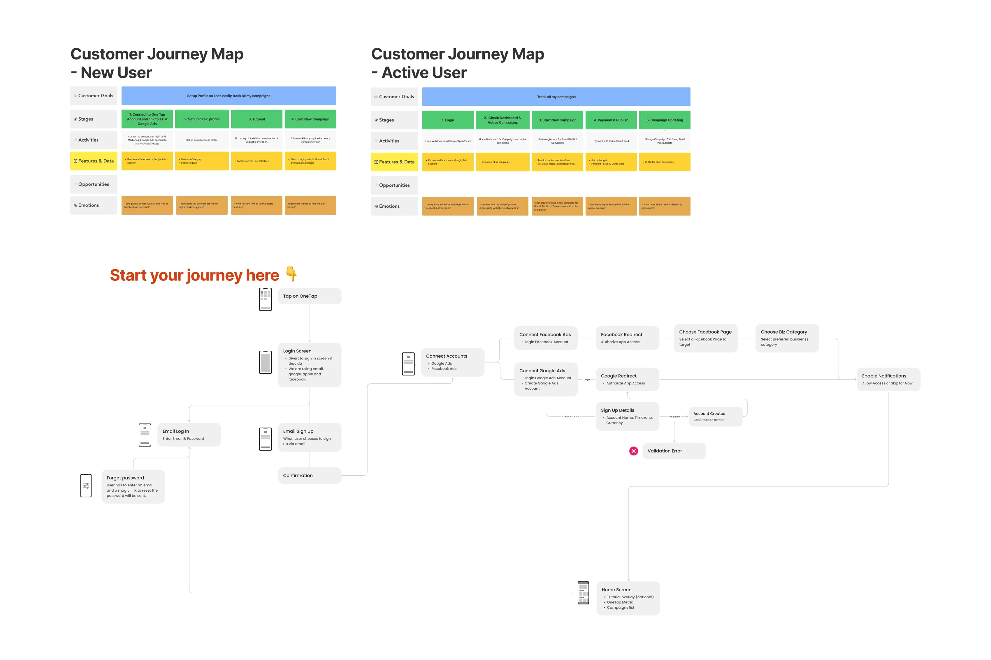 Mapped out the core experience from onboarding to campaign launch, identifying key touchpoints to simplify the complex process of social media marketing.