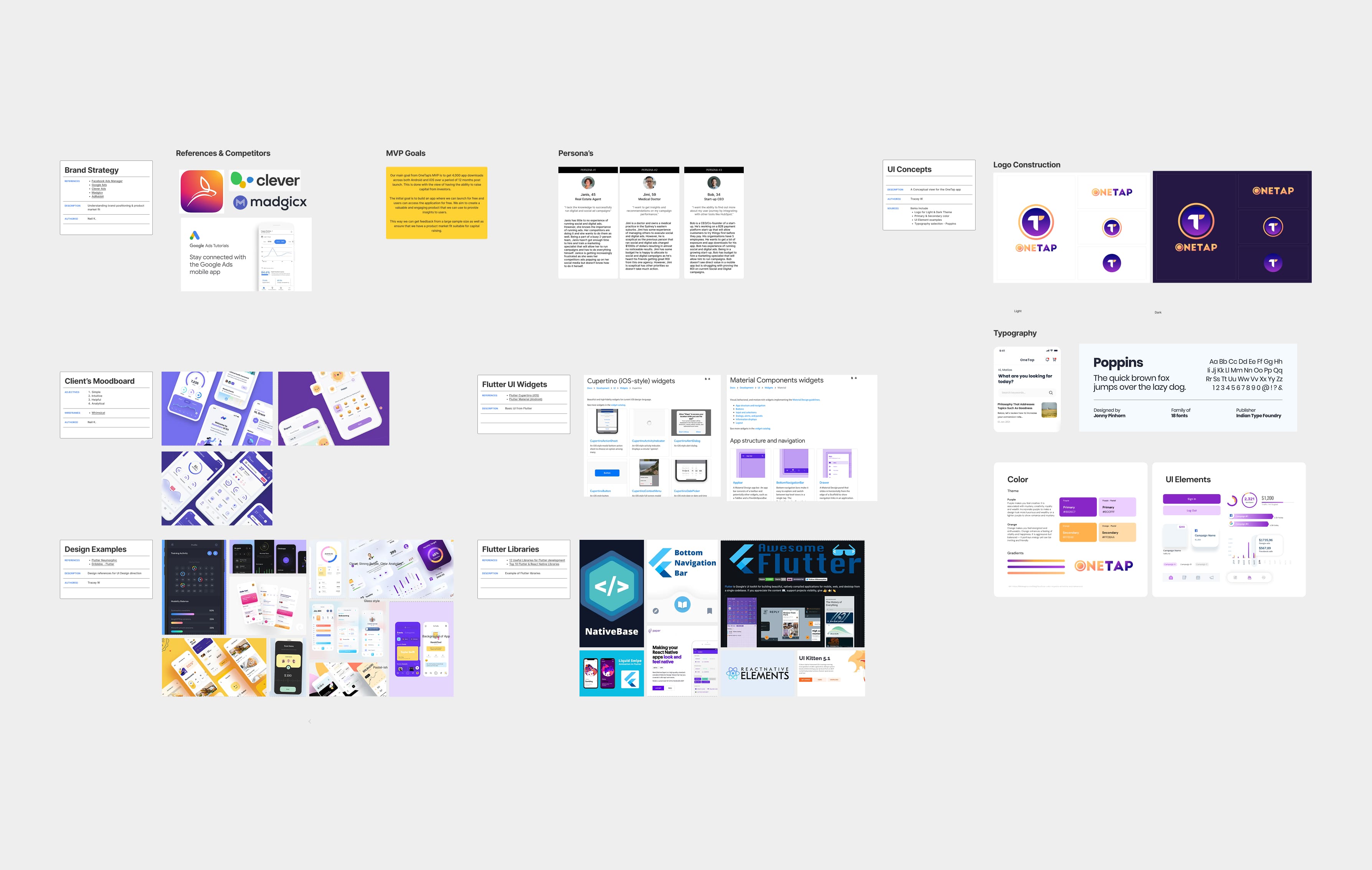One Tap moodboard and style guide — colour palette, typography, and key UI component styles.